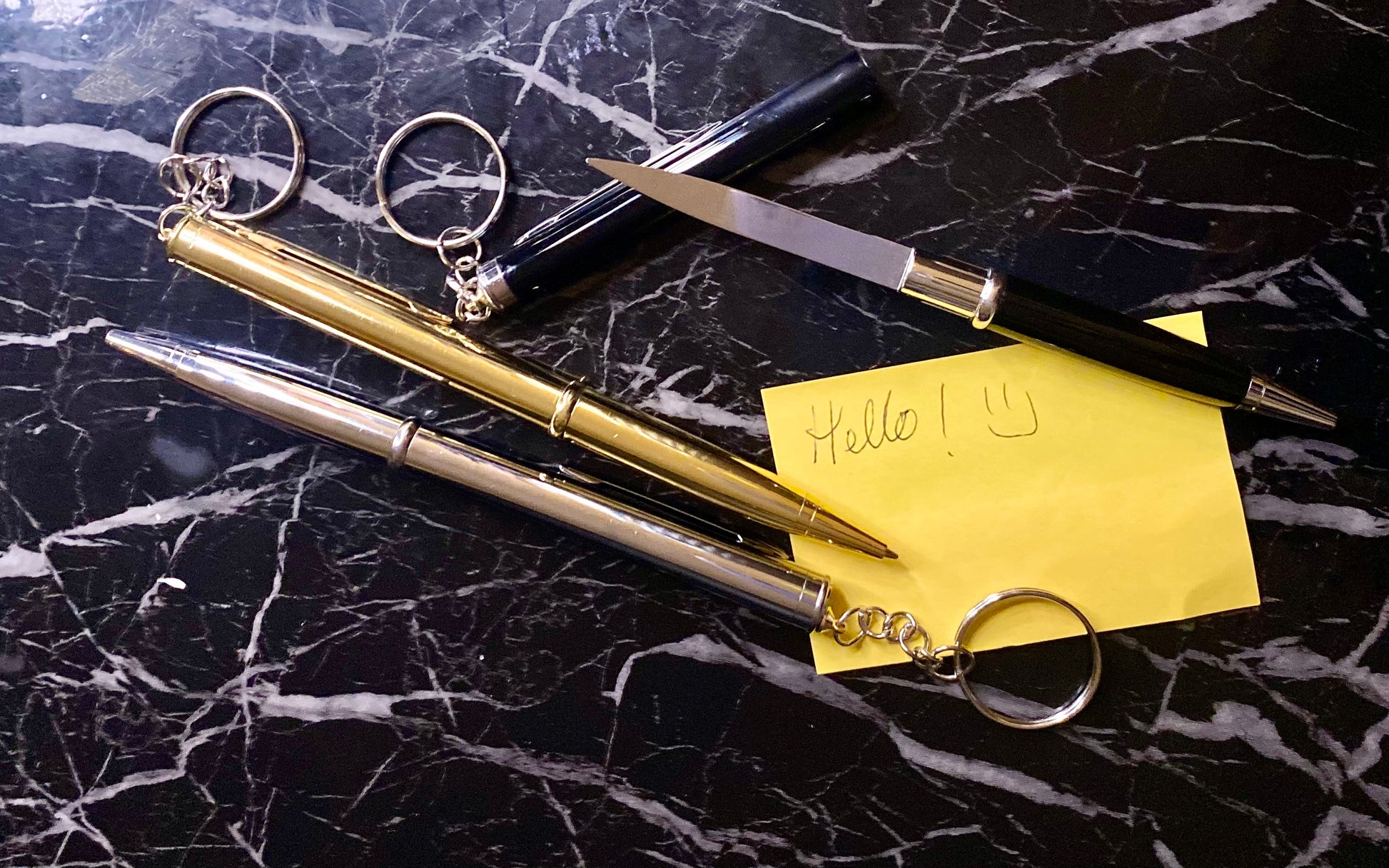 This is a two in one product a slender knife in a functional writing pen. Blade size 5 cm ink color black. Color options: chrome, gold or black. Perfect for writing a letter or opening a letter!